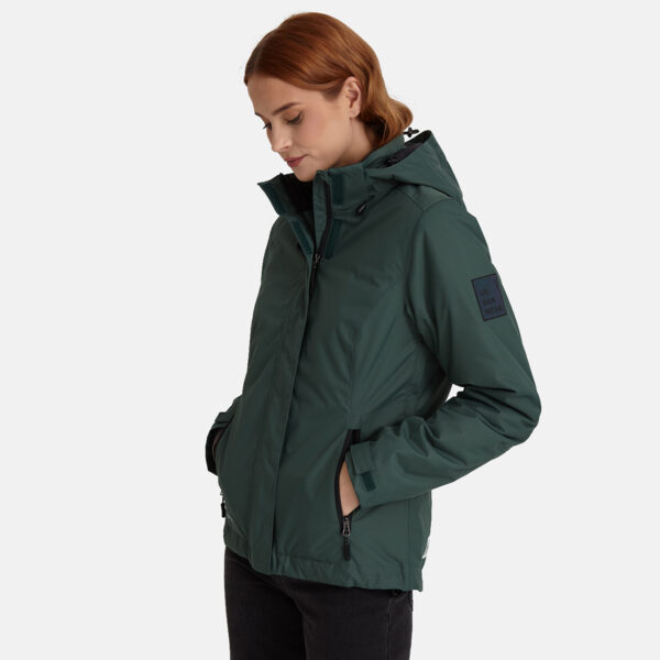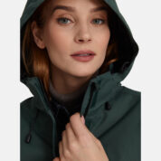 Naisten veden- ja tuulenpitävä kevät- ja syystakki 40 g toppauksella. Irrotettava ja säädettävä huppu kiinnittyy kaulukseen vetoketjulla. Helmassa säädettävä kiristysnauha. Säädettävä huppu ja hihansuut. Tasku etukiinnityksen alla. Ulkokankaassa heijastavia yksityiskohtia.