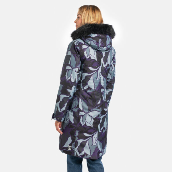 Naisten veden- ja tuulenpitävä talviparka 200 g eristyksellä. Hengittävä ulkokangas. Parkan sisäpuoli on pehmeää kangasta. Lampaannahkajäljitelmävuori yläselässä ja hupun sisäpuolella. Säädettävä huppu. Resorit hihansuissa. Hihanpäät ovat säädettävät. Kaksisuuntainen vetoketju, joka on peitetty painintangolla edessä suljettaessa. Kuminauhatunneli vyötäröllä. Vedenpitävät teipatut saumat. Irrotettava tekoturkisreuna hupussa. Ulkokankaassa heijastavat yksityiskohdat.