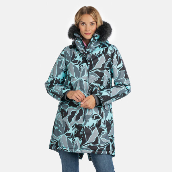 Naisten veden- ja tuulenpitävä talviparka 200 g:n toppauksella. Hengittävä ulkokangas. Parkan sisäpuoli on pehmeää kangasta. Lampaannahkajäljitelmävuori yläselässä ja hupun sisäpuolella. Säädettävä huppu. Resorit hihansuissa. Kaksisuuntainen vetoketju, joka on peitetty tuulisuojalistalla. Magneettisuljetut läpälliset taskut. Säädettävä kiristysnauha vyötäröllä. Vedenpitävät teipatut saumat. Irrotettava tekoturkisreuna hupussa. Ulkokankaassa heijastavat yksityiskohdat.