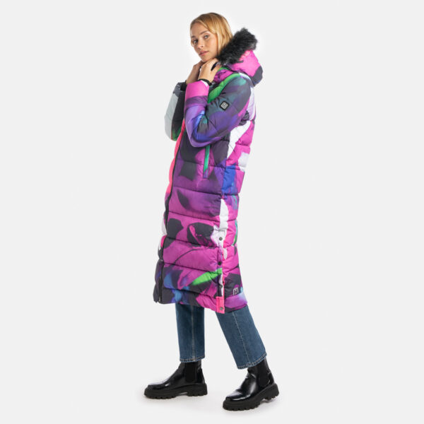 Naisten veden- ja tuulenpitävä, pitkä talvitakki 400 g toppauksella. Hengittävä päällyskangas. Takin sisäpuoli pehmeää vuorikangasta. Irrotettava huppu kiinnittyy kaulukseen painonapeilla. Hihoissa joustinneuleinen ranneke. Vyötärölla säädettävä kiristysnauha. Edessä kaksisuuntainen vetoketju. Hupussa irrotettava tekoturkisreuna. Takin ulkokankaaseen lisätyt heijastinosat parantavät näkyvyyttä pimeän aikana.