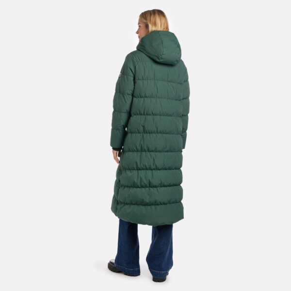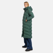 Naisten vettähylkivä ja tuulenpitävä untuvatakki. Hengittävä ulkokangas. Takin sisäpuoli on valmistettu pehmeästä vuorikankaasta. Täytteenä RDS-sertifioitua untuvaa ja höyheniä. Irrotettava huppu kiinnittyy kaulukseen vetoketjulla. Resorit hihansuissa. Kaksisuuntainen vetoketjukiinnitys, hakaskiinnitys alareunassa. Edessä integroidut vetoketjutaskut. Ulkokankaassa heijastavat yksityiskohdat.
