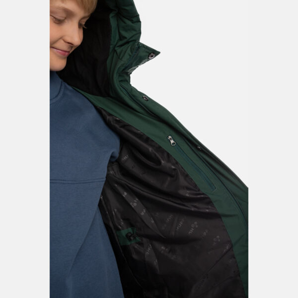 Lasten veden- ja tuulenpitävä talvitakki, jossa 300 g:n eristys. Hengittävä ulkokangas on valmistettu kierrätyskuiduista. Takin sisäpuoli pehmeää vuorikangasta. Hihansuissa sisäänommeltu kuminauha. Etukiinnityksessä nepparilistalla peitetty kaksisuuntainen vetoketju. Vyötäröllä kiristettävä kuminauhakuja. Ulkokankaassa heijastavia yksityiskohtia.