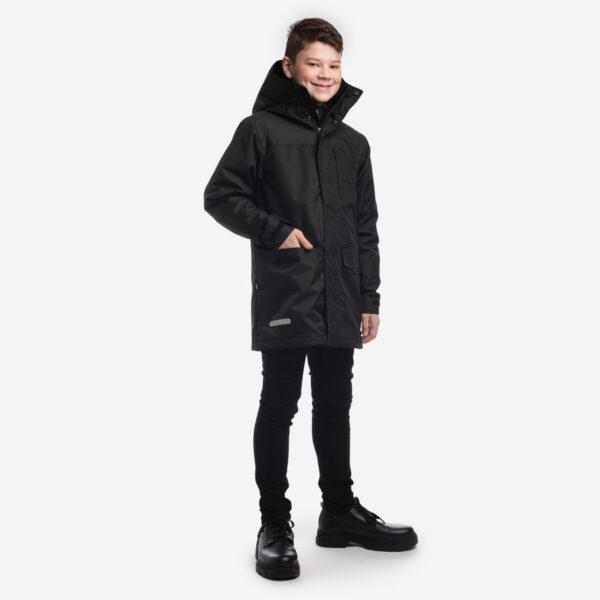 Lasten veden- ja tuulenpitävä takki 40 g vanutäytteellä, joka sopii kevääseen ja syksyyn. Päällikangas on hengittävä ja takin sisällä on pehmeä vuori. Säädettävä huppu ja hihansuut. Olkapäissä on vahva Cordura-kangas. Päällikankaassa on heijastavia yksityiskohtia.