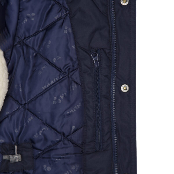 Lasten veden- ja tuulenpitävä talviparka 200 g eristyksellä. Hengittävä ulkokangas. Parkan sisäpuoli on pehmeää kangasta. Lampaannahkajäljitelmävuori yläselässä ja hupun sisäpuolella. Säädettävä huppu. Resorit hihansuissa. Hihanpäät ovat säädettävät. Kaksisuuntainen vetoketju, joka on peitetty painintangolla edessä suljettaessa. Kuminauhatunneli vyötäröllä. Vedenpitävät teipatut saumat. Irrotettava tekoturkisreuna hupussa. Ulkokankaassa heijastavat yksityiskohdat.