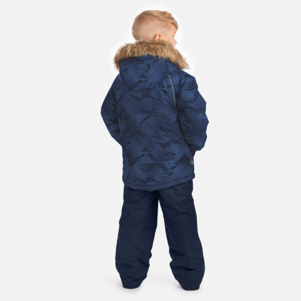 Lasten takki ja housut setti. Veden- ja tuulenpitävä, hengittävä ulkokangas. Takin ja housujen sisäpuoli on valmistettu pehmeästä vuorikankaasta. Hihojen päissä ja vyötäröllä integroitu kuminauha. Irrotettava huppu kiinnittyy kaulukseen tarranauhalla. Hupussa tekoturkisreunus. Housuissa on korkeampi vyötärö ja säädettävät joustavat olkaimet. Joustava vyötärönauha. Kuminauhatunneli, jossa tulpat jalkojen päissä. Vedenpitävät teipatut saumat. Housuissa ei ole sisäsaumaa lahkeessa. Sekä takissa että housuissa on heijastavia yksityiskohtia.