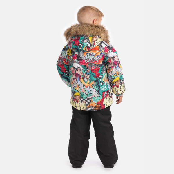 Lasten takki ja housut setti. Veden- ja tuulenpitävä, hengittävä ulkokangas. Takin ja housujen sisäpuoli on valmistettu pehmeästä vuorikankaasta. Hihojen päissä ja vyötäröllä integroitu kuminauha. Irrotettava huppu kiinnittyy kaulukseen tarranauhalla. Hupussa tekoturkisreunus. Housuissa on korkeampi vyötärö ja säädettävät joustavat olkaimet. Joustava vyötärönauha. Kuminauhatunneli, jossa tulpat jalkojen päissä. Vedenpitävät teipatut saumat. Housuissa ei ole sisäsaumaa lahkeessa. Sekä takissa että housuissa on heijastavia yksityiskohtia.