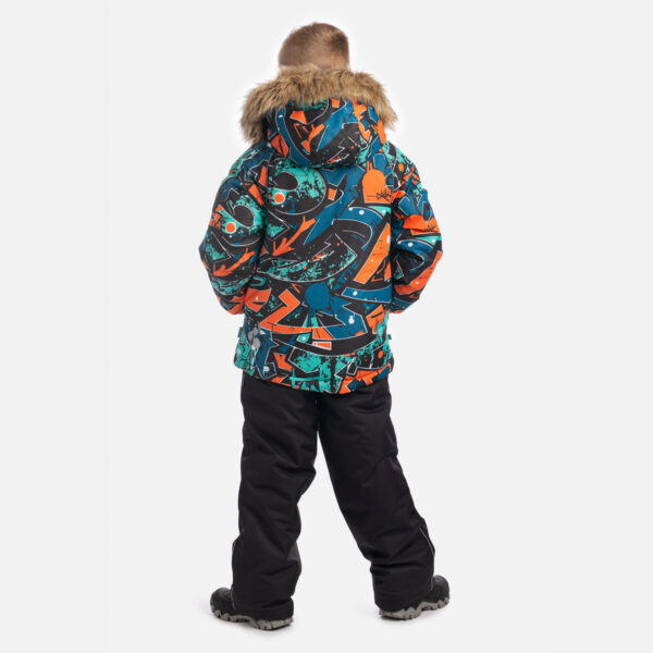 Lasten takki ja housut setti. Veden- ja tuulenpitävä, hengittävä ulkokangas. Takin ja housujen sisäpuoli on valmistettu pehmeästä vuorikankaasta. Hihojen päissä ja vyötäröllä integroitu kuminauha. Irrotettava huppu kiinnittyy kaulukseen tarranauhalla. Hupussa tekoturkisreunus. Housuissa on korkeampi vyötärö ja säädettävät joustavat olkaimet. Joustava vyötärönauha. Kuminauhatunneli, jossa tulpat jalkojen päissä. Vedenpitävät teipatut saumat. Housuissa ei ole sisäsaumaa lahkeessa. Sekä takissa että housuissa on heijastavia yksityiskohtia.
