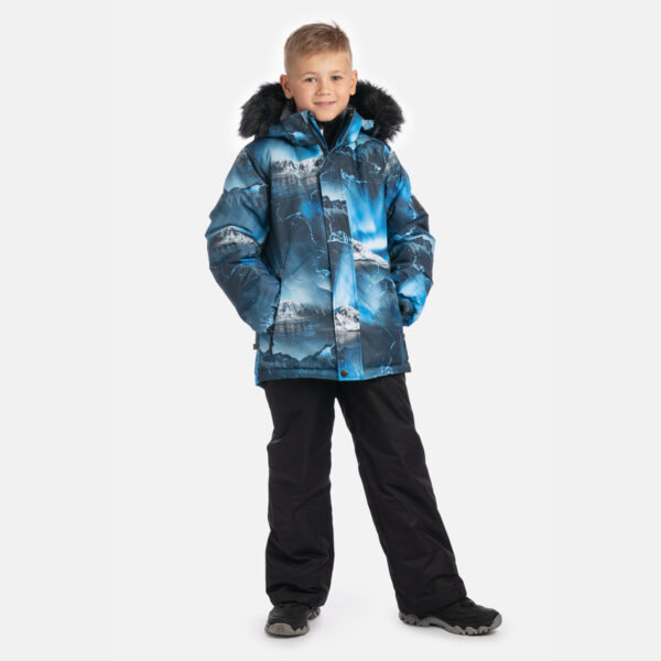 Lasten veden- ja tuulenpitävä takki. Hengittävä ulkokangas. Takin sisäpuoli on valmistettu pehmeästä vuorikankaasta. Irrotettava huppu kiinnittyy kaulukseen tarranauhalla. Hihojen päissä integroitu kuminauha. Vetoketju peitetty säleellä edessä suljettaessa. Edessä integroidut vetoketjulliset taskut. Vedenpitävät teipatut saumat. Irrotettava tekoturkisreuna hupussa. Ulkokankaassa heijastavat yksityiskohdat.