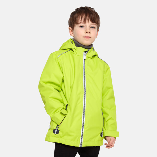 Lasten veden- ja tuulenpitävä kevät- ja syystakki 40g eristyksellä. Hengittävä ulkokangas. Hupun reunassa integroitu kuminauha. Irrotettava huppu kiinnittyy neppareilla takin kaulukseen. Säädettävät hihansuut. Vetoketjukiinnitys. Edessä integroidut taskut. Helmassa kuminauhakuja integroiduilla stoppareilla. Ulkokankaassa heijastavat yksityiskohdat.