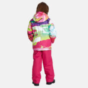 Tyttöjen suosittu kaksiosainen välikausisetti ohuella vanulla (40/40g), joka sopii mainiosti käytettäväksi ulkoleikkeihin. Tyttömäisessä takissa ja korkeavyötäröisissä henkselihousuissa on mukava taftivuori, päällyskangas on meidän ilmastoon sopiva: hengittävä, vettähylkivä ja kestävä. Käyttömukavuutta lisäävät neppareilla kiinnitetty, helposti irrotettava huppu, kuminauhakiristys takin keskiosassa sekä hihansuissa ja housujen säädettävät henkselit sekä kuminauhalla kiristettävät lahkeensuut. Turvallisuutta pimeän aikana lisäävät monet heijastinyksityiskohdat leikkauksissa sekä erillinen lenksu heijastinta varten. Housujen haarasauma teipattu, jotta pikkuneiti voisi nauttia keväästä- syksystä huolehtimatta kosteudesta ja viileästä säästä.