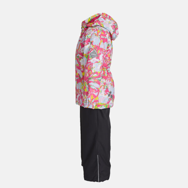 Tyttöjen suosittu kaksiosainen välikausisetti ohuella vanulla (40/40g), joka sopii mainiosti käytettäväksi ulkoleikkeihin. Tyttömäisessä takissa ja korkeavyötäröisissä henkselihousuissa on mukava taftivuori, päällyskangas on meidän ilmastoon sopiva: hengittävä, vettähylkivä ja kestävä. Käyttömukavuutta lisäävät neppareilla kiinnitetty, helposti irrotettava huppu, kuminauhakiristys takin keskiosassa sekä hihansuissa ja housujen säädettävät henkselit sekä kuminauhalla kiristettävät lahkeensuut. Turvallisuutta pimeän aikana lisäävät monet heijastinyksityiskohdat leikkauksissa sekä erillinen lenksu heijastinta varten. Housujen haarasauma teipattu, jotta pikkuneiti voisi nauttia keväästä- syksystä huolehtimatta kosteudesta ja viileästä säästä.