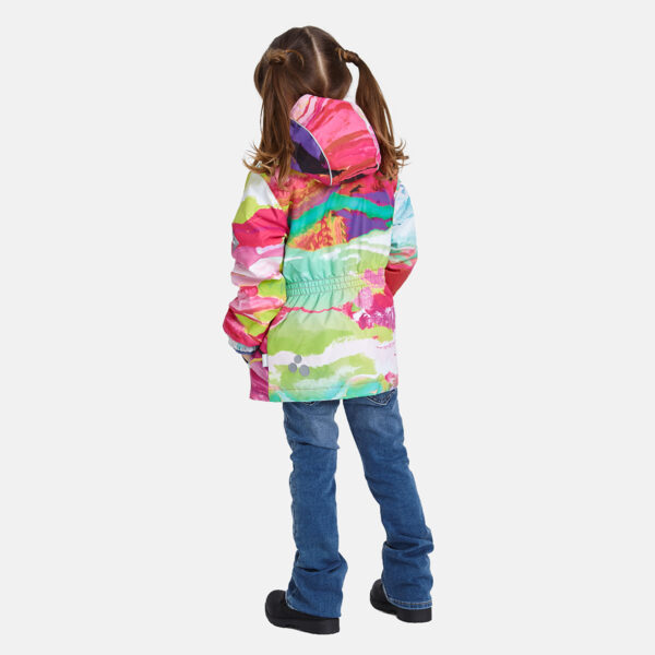 Lasten veden- ja tuulenpitävä takki 40 g eristyksellä. Hengittävä ulkokangas. Integroitu kuminauha hihansuissa, hupun reunassa ja takavyötäröllä. Irrotettava huppu kiinnittyy neppareilla takin kaulukseen. Heijastavat yksityiskohdat edessä ja takana.