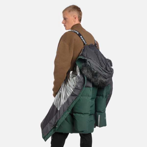 Unisex vettähylkivä ja tuulenpitävä untuvatakki. Hengittävä ulkokangas on valmistettu kierrätyskuiduista. Takin sisäpuoli pehmeää vuorikangasta. Täytteenä RDS-setifioituja höyheniä ja untuvaa. Hihansuissa resorit. Magneetinapeilla kiinnittyvällä tuulilistalla peitetty kaksisuuntainen vetoketju. Takissa on irrotettavat joustavat henkselit. Ulkokankaassa heijastavia yksityiskohtia.