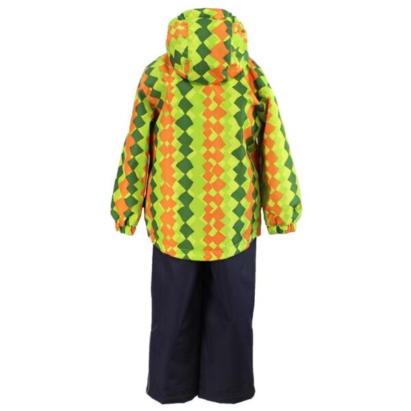 Poikien suosittu kaksiosainen välikausisetti ohuella vanulla (Takki 100/housut 40g). Perustakissa ja korkeavyötäröisissä henkselihousuissa on mukava taftivuori ja hengittävä-, vettähylkivä- ja kestävä päällyskangas on juuri meidän ilmastoon sopiva. Käyttömukavuutta lisäävät neppareilla kiinnitetty, helposti irrotettava huppu, kuminauhat hihansuissa sekä housujen säädettävät henkselit ja kuminauhalla säädettävä alareuna. Housujen haarasauma on teipattu, jotta seikkailuhaluinen poika voisi nauttia keväästä- syksystä huolehtimatta kosteudesta ja viileästä säästä. Turvallisuutta pimeän aikana lisäävät monet heijastinyksityiskohdat leikkauksissa ja lenksu heijastinta varten.