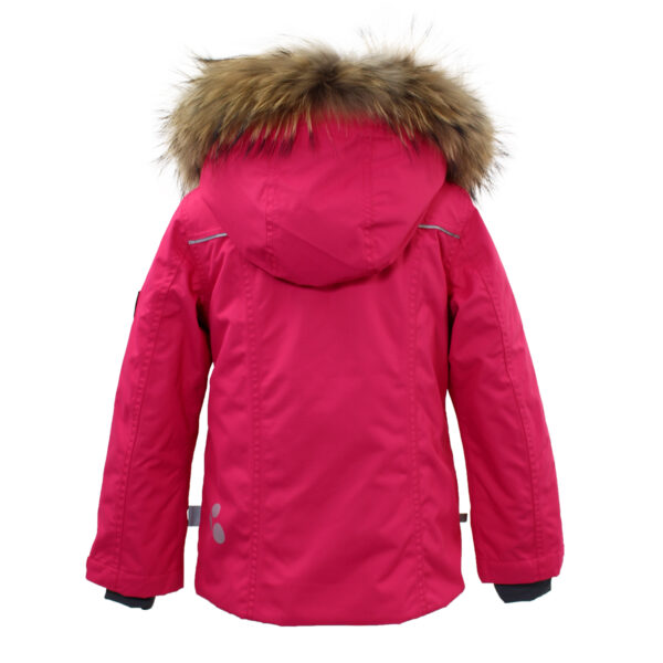 Girls´ winter jacket. The wind and water resistant outer fabric of the jacket has the best technical characteristics and the insulation is 200g. The ribbed inner cuffs in the jacket sleeves and the snow guard keep you warm and dry even when doing sports. The jacket is lined with heat-reflecting HUPPATEC fabric.