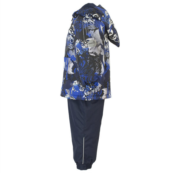 Children´s winter set. The set has a nice soft cotton flannel lining and breathable and waterproof outer fabric that is well suited to our climate. The jacket has 200g and the pants have 100g of insulation. The high-waisted pants have a taped seat seam, which allows the toddler to enjoy winter joys without worry and stay dry and warm at the same time. For more comfortable wearing, the set has a removable fur hood, adjustable elastic suspenders and two great pockets for storing finds. Reflective details in the cutouts allow for safe play even in the dark.