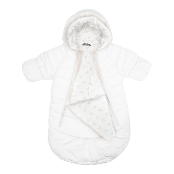 Kūdikių šiltas, neperšlampamas ir neperpučiamas vokelis-kombinezonas Orui laidi išorinė medžiaga Vokelio vidus iš flanelinio pamušalinio audinio Rankogaliuose ir gobtuvo krašte įsiūta guminė juostelė Patogūs atverčiami rankogaliai Kuriant buvo atsižvelgta ir į vaiko saugumą automobilyje – gaminio užpakalyje yra skylės saugos lopšio diržams pritvirtinti, todėl vaikas prie saugos lopšio bus prisegtas saugiai Automobilinės kėdutės diržų negalima juosti ant drabužių, nes vaikas nebus saugiai prisegtas Važiavimas automobiliu bus ne tik saugus, bet ir patogus, nes vaikas automobilyje nesukais Vokelį-kombinezoną galima patogiai atsegti, saugos lopšio diržus susegti virš drabužių, o prireikus išeiti į lauką, kombinezoną galima ir vėl greitai aprengti