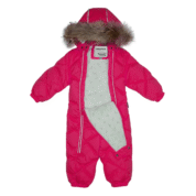 Dygsniuotas pūkinis kombinezonas mažyliams. Kombinezonas turi minkštą medvilninį flanelinį pamušalą ir kvėpuojančią, vėjui ir vandeniui atsparią išorinę medžiagą. Kombinezonas yra su dviem ilgais užtrauktukais, nuimamu gobtuvu ir kailiu, kišenė su čiulptuko dirželiu būtiniems daiktams susidėti ir silikoninėmis gumytėmis po padu. Iki 80 dydžio rankovės galus ir apatinį kraštą galima atlenkti vos keliais judesiais, nereikia nei pirštinių, nei batų.