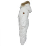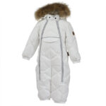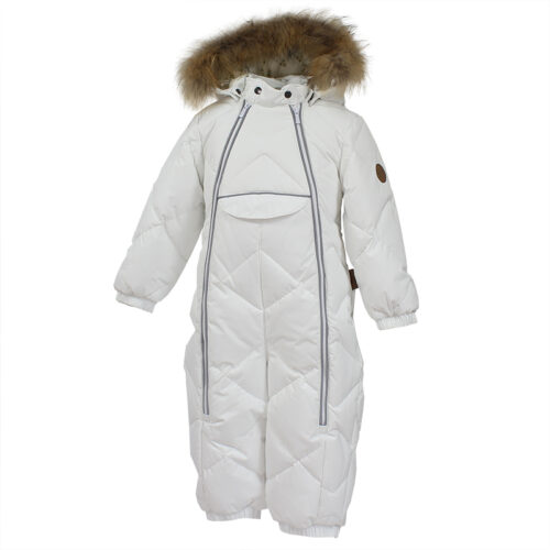 Dygsniuotas pūkinis kombinezonas mažyliams. Kombinezonas turi minkštą medvilninį flanelinį pamušalą ir kvėpuojančią, vėjui ir vandeniui atsparią išorinę medžiagą. Kombinezonas yra su dviem ilgais užtrauktukais, nuimamu gobtuvu ir kailiu, kišenė su čiulptuko dirželiu būtiniems daiktams susidėti ir silikoninėmis gumytėmis po padu. Iki 80 dydžio rankovės galus ir apatinį kraštą galima atlenkti vos keliais judesiais, nereikia nei pirštinių, nei batų.