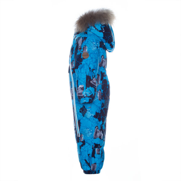 Kūdikių neperšlampantis ir vėjui atsparus minkštas kombinezonas su plunksnų užpildu. Kvėpuojantis audinys. Flanelės pamušalas viduje. Elastinė juosta rankovių ir kojų galuose bei liemens nugaros srityje. 62-80 dydžių kombinezonuose rankovės ir kojų galai gali būti patogiai užlenkti. Elastinės pėdų juostelės. Nuimamas dirbtinis kailis ant kapišono. Šviesą atspindintys elementai ant audinio.