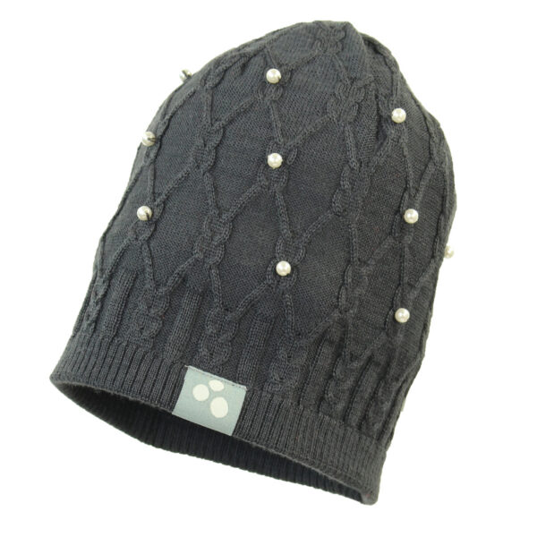 Plona megzta mergaičių kepurė papuošta kristalais. Pagaminta iš 50% merino vilnos, 50% akrilo ir turi 100% medvilnės trikotažo pamušalą.