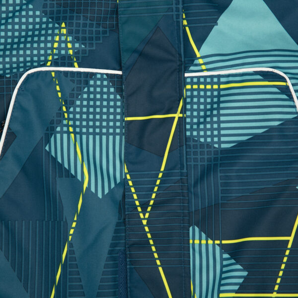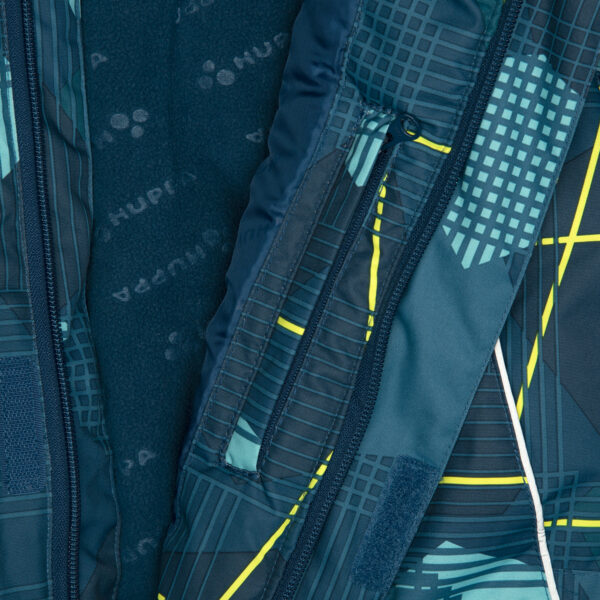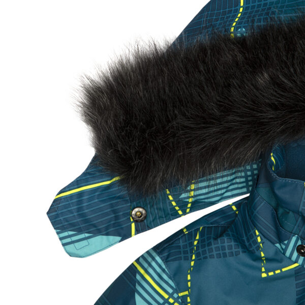 Vaikiškas neperšlampamas ir neperpučiamas kombinezonas Orui laidi išorinė medžiaga Vidinė dalis iš minkšto pamušalinio audinio Nuimamas gobtuvas prie apykaklės prisegamas kibiu lipduku Gobtuvo krašte ir gale įsiūta reguliuojama guminė juostelė Rankovių apačioje tamprus rankogalis Rankovių apačia reguliuojama Priekyje juostele dengtas užtrauktukas Priekyje įsiūtos kišenės su užtrauktuku Į juosmenį įsiūta guminė juostelė su skylutėmis sagoms Apatinė klešnių dalis iš patvaraus Cordura audinio Klešnių apačioje apsaugos nuo sniego Klešnių apačioje įsiūta guminė juostelė su fiksatoriais Vandeniui atsparios siūlės Gobtuvas apkraštuotas nuimamu dirbtiniu kailiu Viršutinis audinys su šviesą atspindinčiomis detalėmis