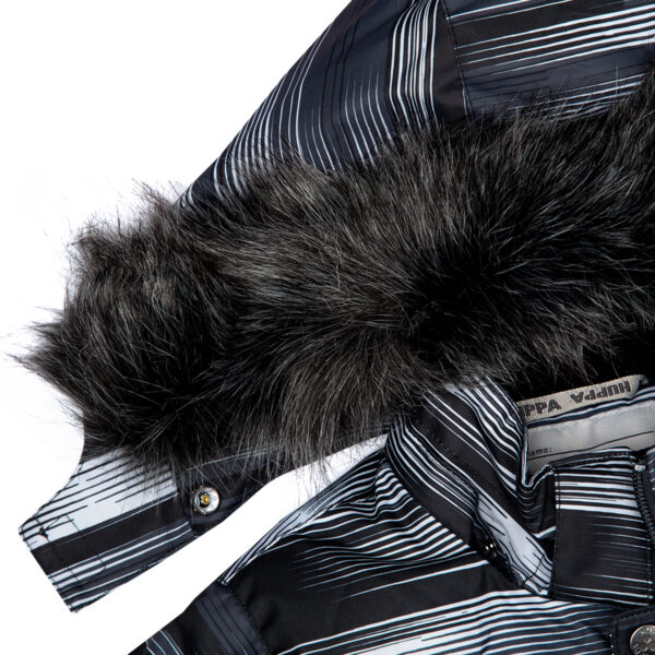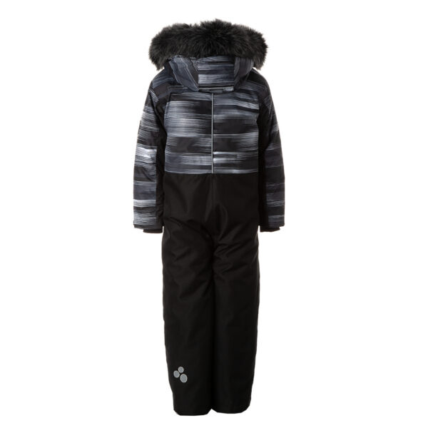 Vaikiškas neperšlampamas ir neperpučiamas kombinezonas Orui laidi išorinė medžiaga Vidinė dalis iš minkšto pamušalinio audinio Nuimamas gobtuvas prie apykaklės prisegamas kibiu lipduku Gobtuvo krašte ir gale įsiūta reguliuojama guminė juostelė Rankovių apačioje tamprus rankogalis Rankovių apačia reguliuojama Priekyje juostele dengtas užtrauktukas Priekyje įsiūtos kišenės su užtrauktuku Į juosmenį įsiūta guminė juostelė su skylutėmis sagoms Apatinė klešnių dalis iš patvaraus Cordura audinio Klešnių apačioje apsaugos nuo sniego Klešnių apačioje įsiūta guminė juostelė su fiksatoriais Vandeniui atsparios siūlės Gobtuvas apkraštuotas nuimamu dirbtiniu kailiu Viršutinis audinys su šviesą atspindinčiomis detalėmis