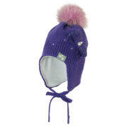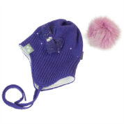 Mergaičių žiemos kepurė su rišimu. Kepurės pamušalas iš medvilnės trikotažo, viršutinis sluoksnis 100% akrilo. Papuošalas – nuimamas kutukas viršuje ir kristalai.