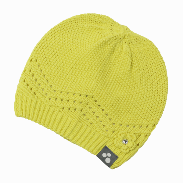 Girls´ thinner knitted spring-autumn hat. The hat with a cute pattern is knitted from a of 60% cotton, 40% acrylic yarn blend. The hat is decorated with a little star with a stone. The bottom edge of the hat is knitted in rib.