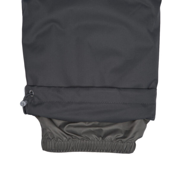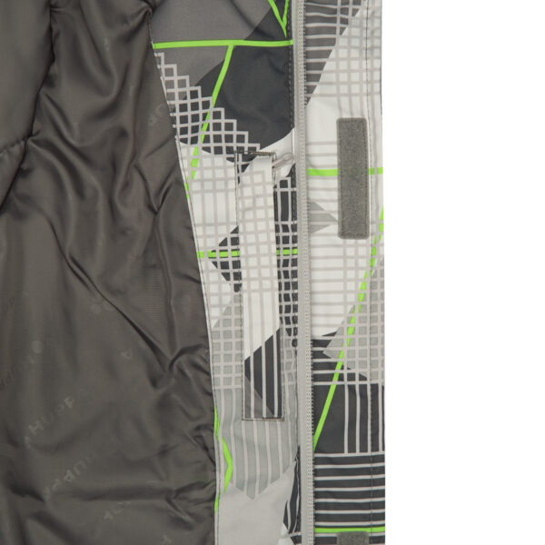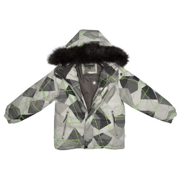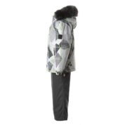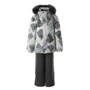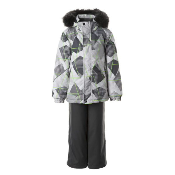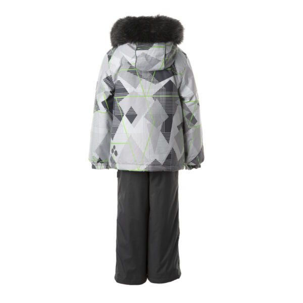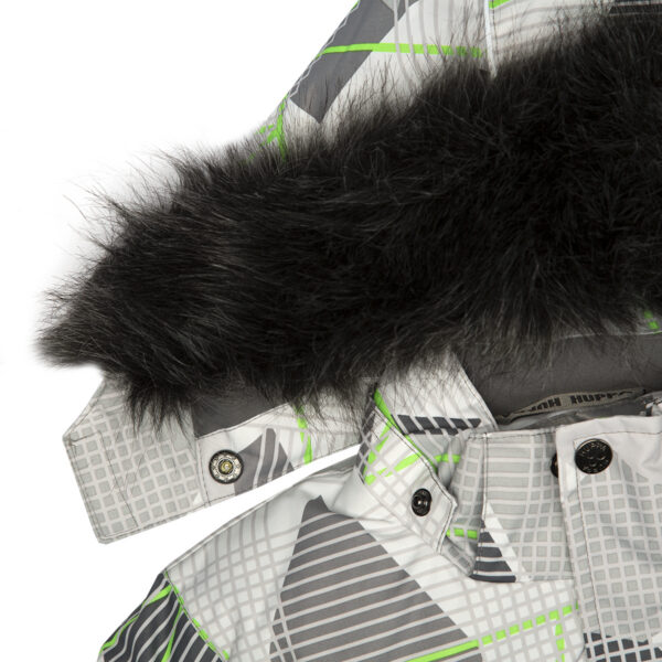 Vaikiškas striukės ir kelnių komplektas Neperšlampamas ir neperpučiamas, orui laidus viršutinis audinys Striukės ir kelnių vidinė pusė iš minkšto pamušalinio audinio Rankovių apačioje įsiūta guminė juostelė Nuimamas gobtuvas prie apykaklės prisegamas kibiu lipduku Gobtuvas apkraštuotas nuimamu dirbtiniu kailiu Kelnės aukštesniu liemeniu ir turi reguliuojamas elastines petnešas Juosmenyje įsiūta guminė juostelė Klešnių apačioje apsaugos nuo sniego Klešnių apačioje įsiūta guminė juostelė su fiksatoriais Vandeniui atsparios siūlės Kelnėse nėra klešnių vidinės siūlės Ant striukės ir kelnių šviesą atspindinčios detalės