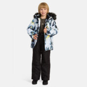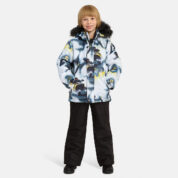 Vaikiškas žieminis striukės ir kelnių komplektas. Neperšlampamas, neperpučiamas ir laidus orui išorinis audinys. Vidinė striukės ir kelnių dalis iš minkšto pamušalo audinio. Striukė turi 300 g šiltinamąjį sluoksnį, o kelnės – 160 g šiltinamąjį sluoksnį. Rankogaliuose guminės juostelės. Nuimamas gobtuvas prie apykaklės prisegamas užtrauktuku. Nuimamas gobtuvo apvadas iš dirbtinio kailio. Kelnės turi nuimamas reguliuojamas elastines petnešas. Juosmens dalyje guminė juosta. Klešnių apačioje yra nuo sniego saugančios detalės. Klešnių apačioje guminės virvelės tunelis su stabdikliais. Neperšlampamos dengtos siūlės. Tiek striukė, tiek kelnės turi šviesą atspindinčių detalių.