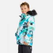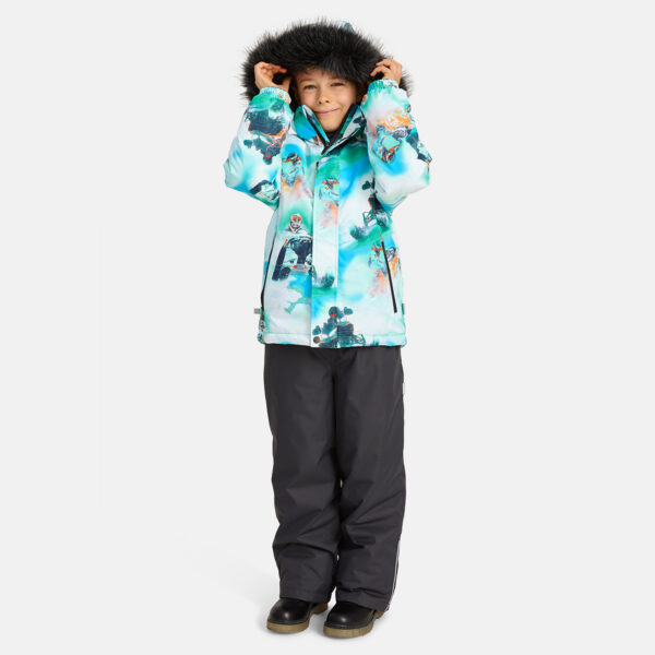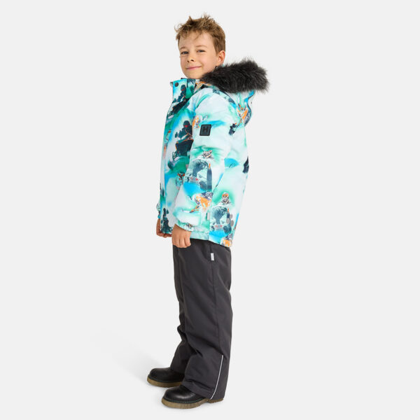Vaikiškas žieminis striukės ir kelnių komplektas. Neperšlampamas, neperpučiamas ir laidus orui išorinis audinys. Vidinė striukės ir kelnių dalis iš minkšto pamušalo audinio. Striukė turi 300 g šiltinamąjį sluoksnį, o kelnės – 160 g šiltinamąjį sluoksnį. Rankogaliuose guminės juostelės. Nuimamas gobtuvas prie apykaklės prisegamas užtrauktuku. Nuimamas gobtuvo apvadas iš dirbtinio kailio. Kelnės aukštesniu juosmeniu ir reguliuojamomis elastinėmis petnešomis. Juosmens dalyje guminė juosta. Klešnių apačioje yra nuo sniego saugančios detalės. Klešnių apačioje guminės virvelės tunelis su stabdikliais. Neperšlampamos dengtos siūlės. Kelnėse nėra vidinių siūlių. Tiek striukė, tiek kelnės turi šviesą atspindinčių detalių.