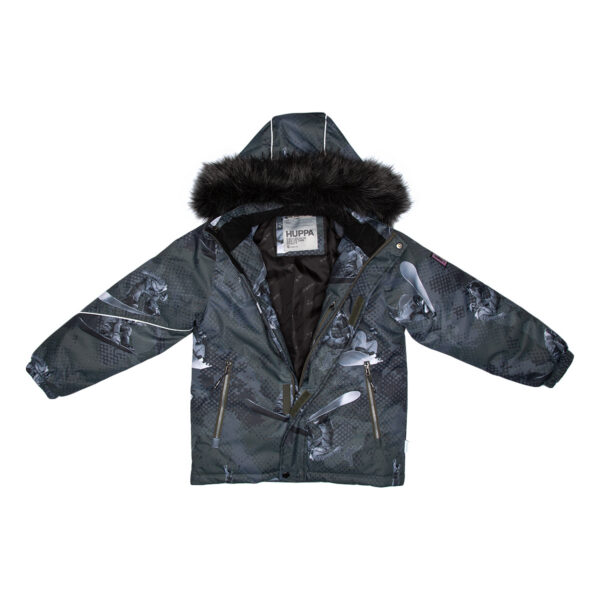 Vaikiškas striukės ir kelnių komplektas Neperšlampamas ir neperpučiamas, orui laidus viršutinis audinys Striukės ir kelnių vidinė pusė iš minkšto pamušalinio audinio Rankovių apačioje įsiūta guminė juostelė Nuimamas gobtuvas prie apykaklės prisegamas kibiu lipduku Gobtuvas apkraštuotas nuimamu dirbtiniu kailiu Kelnės turi nuimamas ir reguliuojamas elastines petnešas Juosmenyje įsiūta guminė juostelė Klešnių apačioje apsaugos nuo sniego Klešnių apačioje įsiūta guminė juostelė su fiksatoriais Vandeniui atsparios siūlės Ant striukės ir kelnių šviesą atspindinčios detalės