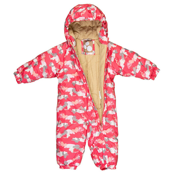 Žiemos kombinezonas mažyliams. Kombinezonas turi vėjui ir vandeniui atsparų viršutinį audinį, minkštą medvilnės flanelės pamušalą ir 300g šiltinimą. 68-80 dydžiuose rankovių ir kojų galus galima užraitoti. Ilgas užtrauktukas palengvina ir pagreitina rengimą, o kojų galai taip pat padengti viršutiniu audiniu iš vidaus. Kad vaikas būtų matomas net tamsoje, kombinezone yra atšvaitinės detalės.