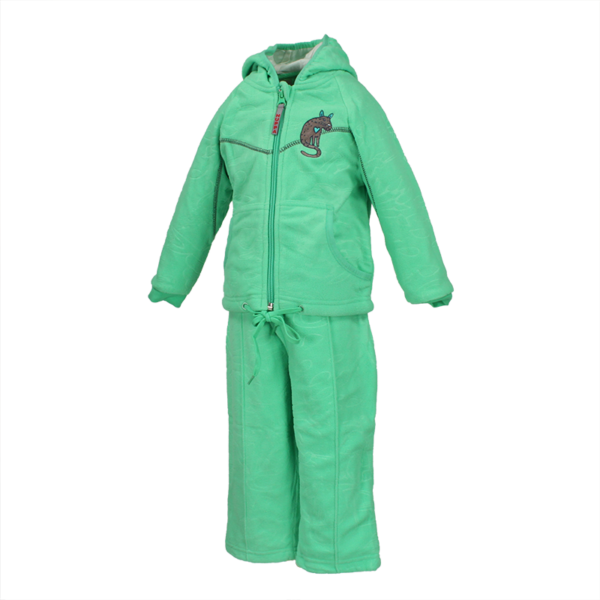 Komplekt jakk ja püksid, mille pealiskangas on pehme fliis- 100% polüester. Voodriks on trikotaaž – 100% puuvill. Jakil on taskud, kapuuts ning kaunistuseks armas tikand.