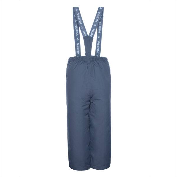 Vaikiškos neperšlampamos ir neperpučiamos kelnės Orui laidi išorinė medžiaga Kelnių vidinė pusė iš minkšto pamušalinio audinio Reguliuojamos nuimamos petnešos Juosmenyje įsiūta elastinga guminė juostelė Klešnių apačioje įsiūta guminė juostelė su fiksatoriais ir apsauga nuo sniego Vandeniui atsparios siūlės Kelnių apačioje šviesą atspindinčios detalės