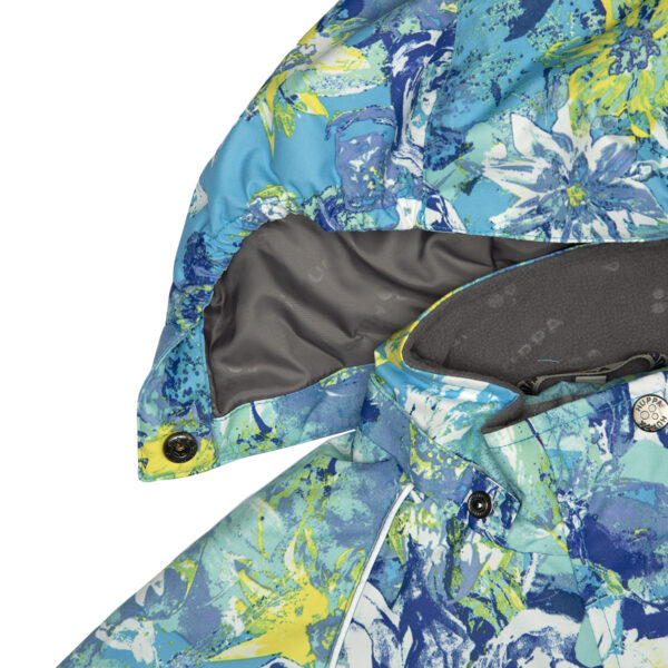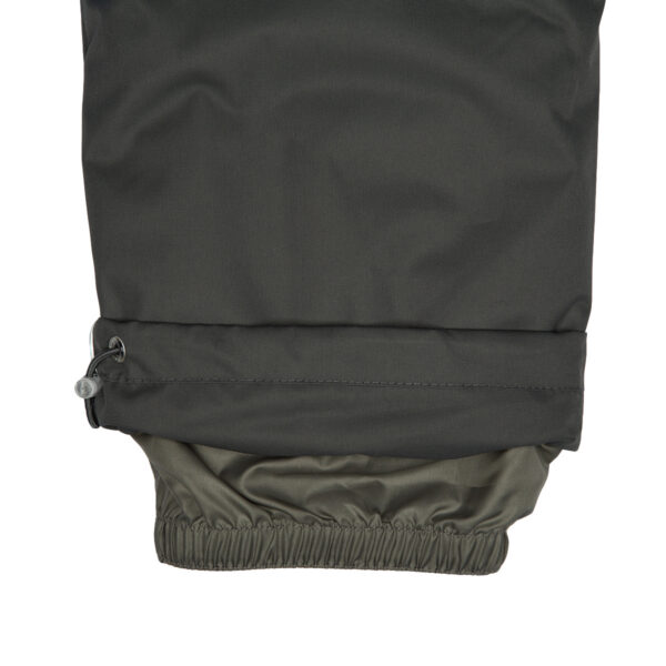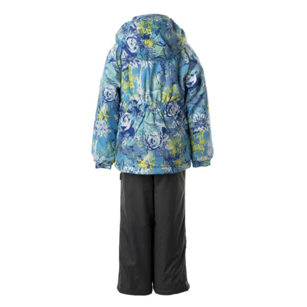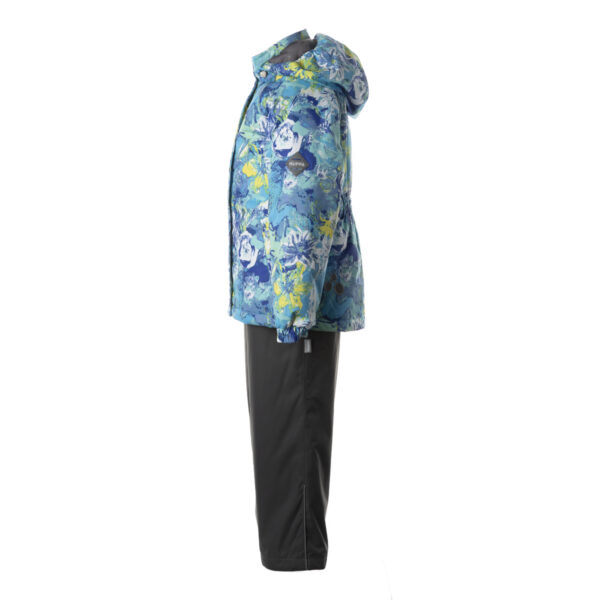Vaikiškas striukės ir kelnių komplektas Neperšlampamas ir neperpučiamas, orui laidus viršutinis audinys Striukės ir kelnių vidinė pusė iš minkšto pamušalinio audinio Rankovių apačioje, juosmenyje ir gobtuvo krašte įsiūta guminė juostelė Nuimamas gobtuvas prie apykaklės prisegamas kibiu lipduku Kelnės aukštesniu liemeniu ir turi reguliuojamas elastines petnešas Juosmenyje įsiūta guminė juostelė Klešnių apačioje įsiūta guminė juostelė su fiksatoriais Vandeniui atsparios klijuotos siūlės Kelnėse nėra klešnių vidinės siūlės Ant striukės ir kelnių šviesą atspindinčios detalės