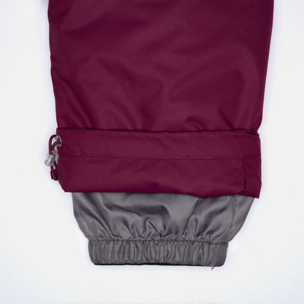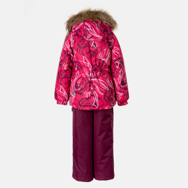 Vaikiškas striukės ir kelnių komplektas. Neperšlampamas ir neperpučiamas, orui laidus viršutinis audinys. Striukės ir kelnių vidinė pusė iš minkšto pamušalinio audinio. Rankovių apačioje ir ant juosmens įsiūta guminė juostelė. Nuimamas gobtuvas prie apykaklės prisegamas kibiu lipduku. Gobtuvas apsiūtas dirbiniu kailiu. Kelnės aukštesniu liemeniu ir turi reguliuojamas elastines petnešas. Juosmenyje įsiūta guminė juostelė. Klešnių apačioje įsiūta guminė juostelė su fiksatoriais. Vandeniui atsparios klijuotos siūlės. Kelnėse nėra klešnių vidinės siūlės. Ant striukės ir kelnių šviesą atspindinčios detalės.