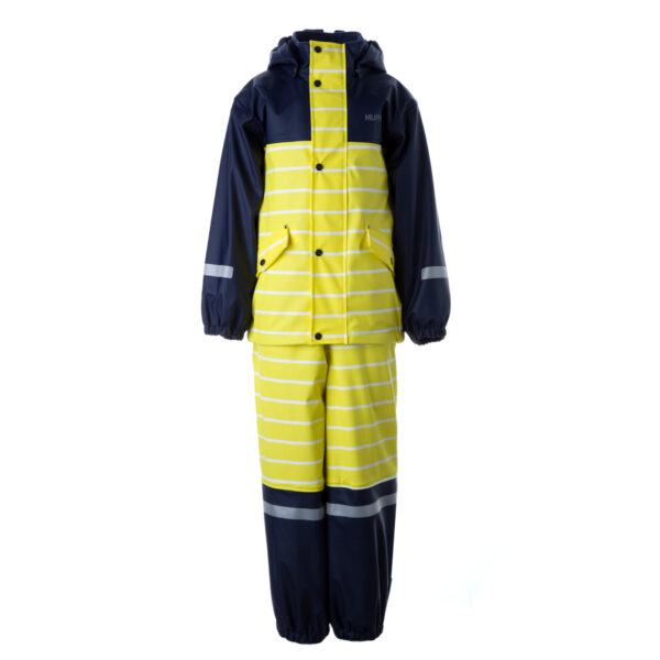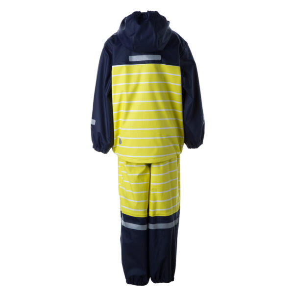 Vandeniui ir vėjui atsparus 2-jų dalių lietaus komplektas vaikams. . Vidinis ir striukės ir kelnių pamušalas iš minkšto ir šilto fliso. Nuimamas gobtuvas tvirtinasi spaudėmis. Suvirintos siūlės . Kelnės su paaukštintu liemeniu turi elastinius laikiklius ant pėdų . Komplektas dekoruotas šviesą atspindinčiomis detalėmis.Patogu dėvėti drėgnomis,lietingomis dienomis ir ypač rekomenduojame turėti darželyje.