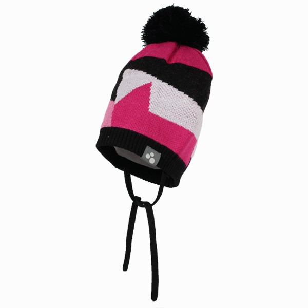 Spalvinga megzta žiemos kepurė vaikams. Kepurės pamušalas pagamintas iš medvilnės trikotažo, o viršus – iš akrilo siūlų.