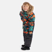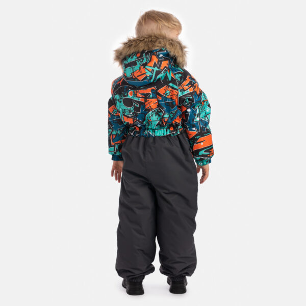 Vaikiškas neperšlampamas ir neperpučiamas žieminis kombinezonas su 200 g šiltinamuoju sluoksniu. Laidus orui išorinis audinys. Kombinezono vidinė dalis iš minkšto audinio. Guminė juostelė rankogaliuose, klešnių apačioje ir ant gobtuvo krašto. Nuimamas gobtuvas prie apykaklės prisegamas užtrauktuku. Juosmens srityje guminė juosta su kilpomis. Neperšlampamos dengtos siūlės. Su elastingomis pėdos gumelėmis. Šviesą atspindinčios detalės ant viršutinio audinio.