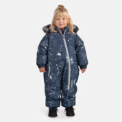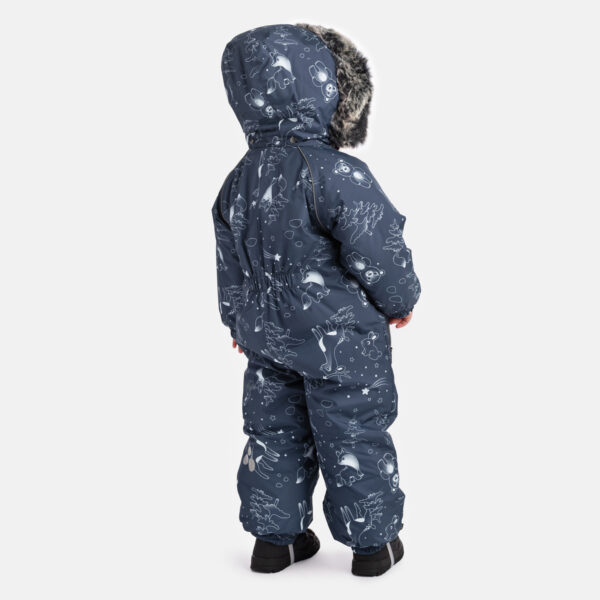Kūdikių žieminis kombinezonas atsparus vandeniui ir vėjui su 300 g pašiltinimu. Kvėpuojantis audinys ir minkštas flanelinis pamušalas viduje užtikrina komfortą visą dieną. Praktiškas dizainas: elastingi rankogaliai ir kelnių galai bei elastinga juosmens juosta nugaroje. Nuimamas spaudėmis segamas gobtuvas yra saugus. Dydžiuose 68–80 rankogalius ir klešnių galus galima atlenkti, kad drabužis tarnautų ilgiau. Visiškai užklijuotos vandeniui atsparios siūlės, dirbtinio kailio gobtuvo apvadas ir atšvaitinės detalės ant išorinio audinio suteikia drabužiui komforto, saugumo ir stiliaus.