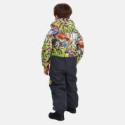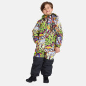 Vaikiškas neperšlampamas ir neperpučiamas pereinamojo sezono kombinezonas su 100 g šiltinamuoju sluoksniu. Laidus orui išorinis audinys. Guminė juostelė rankogaliuose, klešnių apačioje ir ant gobtuvo krašto. Nuimamas gobtuvas prie apykaklės prisegamas užtrauktuku. Juosmens srityje guminė juosta su kilpomis. Neperšlampamos dengtos siūlės. Su elastingomis pėdos gumelėmis. Šviesą atspindinčios detalės ant viršutinio audinio.