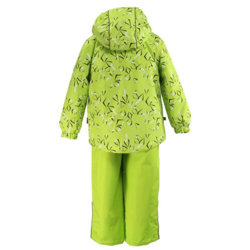 Bērnu starpsezonas jakas un bikšu komplekts. Ūdens- un vēja izturīgs, elpojošs virsaudums. Jakas un bikšu iekšpusē ir mīksts oderaudums. Piedurkņu galos un kapuces malā iestrādāta gumijas lente. Noņemamā kapuce pie apkakles nostiprināma ar spiedpogām. Biksēm ir augstāka jostasvieta un regulējamas, elastīgas lences. Jostasvietā iestrādāta gumijas lente. Staru galos gumijas auklas tunelis ar iestrādātām atdurēm. Ūdensnoturīga, stepēta sēžas šuve. Biksēm nav staras iekšējās šuves. Gan jakai, gan biksēm ir atstarojošas detaļas.