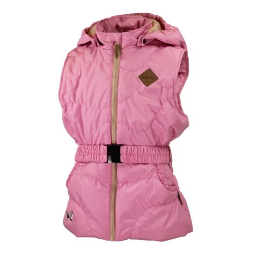 Mergaičių liemenė. Pamušalas: tafta + aksomas, medvilnės ir poliesterio mišinys, plonas 120 g pašiltinimas. Gražus siuvinėjimai ant liemenės. Nuimamas gobtuvas su kniedėmis.