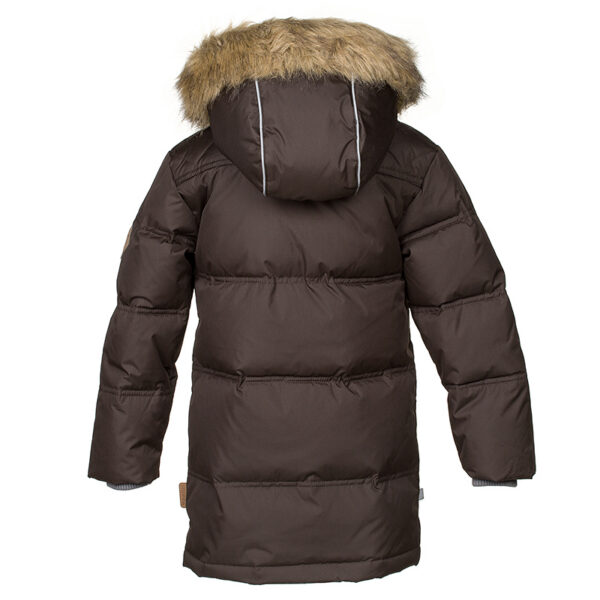 Berniukų pūkinė parka. Parkos viršutinis audinys yra vėjui ir vandeniui atsparus ir turi tafetos pamušalą. Parka pripildyta 50% plunksnų ir 50% pūkų. Elastiniai vidiniai rankovių apvadai ir reguliuojamas liemuo padeda išlaikyti šilumą ir sausumą. Viršutinis audinys turi atšvaitines detales. Nuimamas gobtuvas pritvirtintas prie apykaklės spaudukais, o jo natūralaus kailio apdaila taip pat nuimama. Parkos užtrauktukas atsidaro iš viršaus ir apačios, o kišenės turi užtrauktuką ir spaudukus.