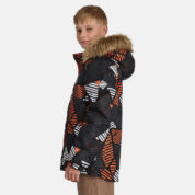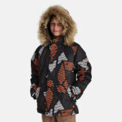 Vaikiška neperšlampama ir neperpučiama striukė Orui laidi išorinė medžiaga Vidinė striukės dalis iš minkšto pamušalinio audinio Nuimamas gobtuvas prie apykaklės prisegamas kibiu lipduku Rankovių apačioje įsiūta guminė juostelė Priekyje kibia juostele dengtas užtrauktukas Priekyje įsiūtos kišenės su užtrauktuku Gobtuvas apsiūtas dirbiniu kailiu Viršutinis audinys su šviesą atspindinčiomis detalėmis