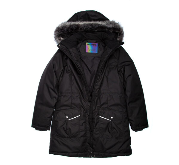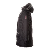 Moteriška neperšlampama ir neperpučiama žieminė parka. Orui laidi išorinė medžiaga. Vidinė parkos dalis iš minkšto pamušalinio audinio. Nuimamas gobtuvas prie apykaklės prisegamas kibiu lipduku. Rankovių apačioje tamprus rankogalis. Juosmenyje įsiūta guminė juostelė su fiksatoriais. Vandeniui atsparios klijuotos siūlės. Gobtuvas apsiūtas dirbiniu kailiu. Viršutinis audinys su šviesą atspindinčiomis detalėmis.