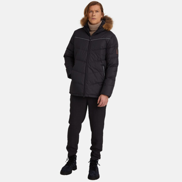 Vėjo ir vandens nepraleidžianti pūkinė striukė vyrams. Striukė su taftos pamušalu. Striukės užpildas: 50% plunksnų ir 50% pūkų. Vidiniai rankogaliai rankovėse išlaiko šilumą ir vėjuotu oru. Šviesą atspindinčios detalės ant išorinio audinio. Nuimamas gobtuvas pritvirtinamas prie apykaklės spaudėmis, natūralaus kailio kraštas taip pat nuimamas.