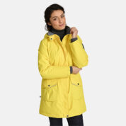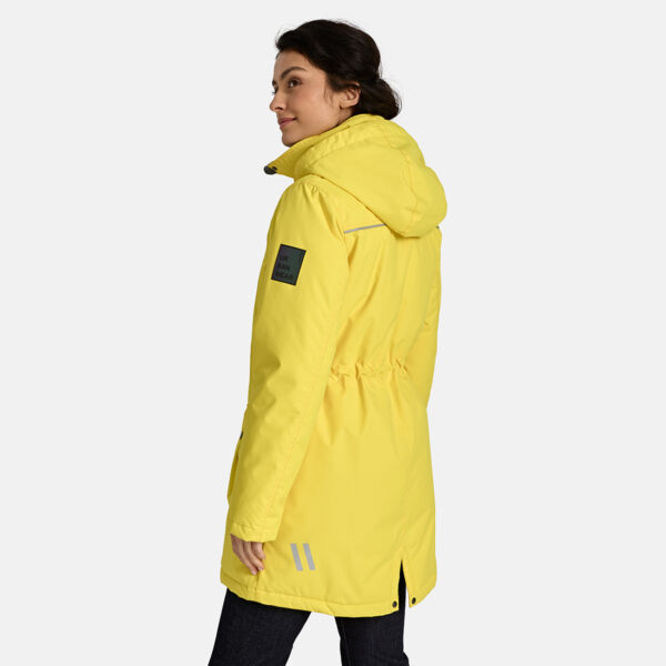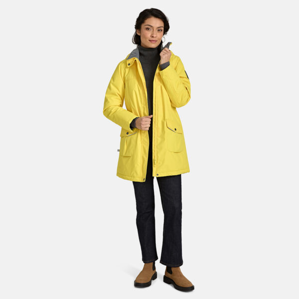 Moteriška neperšlampama ir neperpučiama demisezoninė parka Orui laidi išorinė medžiaga Vidinė parkos dalis iš minkšto pamušalinio audinio Nuimamas gobtuvas prie apykaklės prisegamas kibiu lipduku Rankovių apačioje tamprus rankogalis Juosmenyje įsiūta guminė juostelė su fiksatoriais Vandeniui atsparios klijuotos siūlės Viršutinis audinys su šviesą atspindinčiomis detalėmis